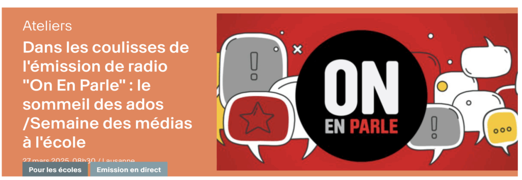 La RTS organise toutes sortes d’ateliers, de la 5H à la 11S ; je vous laisse découvrir l’étendue du choix (attention brochure 2024-2025 !) : https://avecvous.rts.ch/upload/cms/Ateliers/2024_BROCHURE_ATELIERS_EDU-MEDIAS_PROD_DEF.pdf?_t=1726214358
