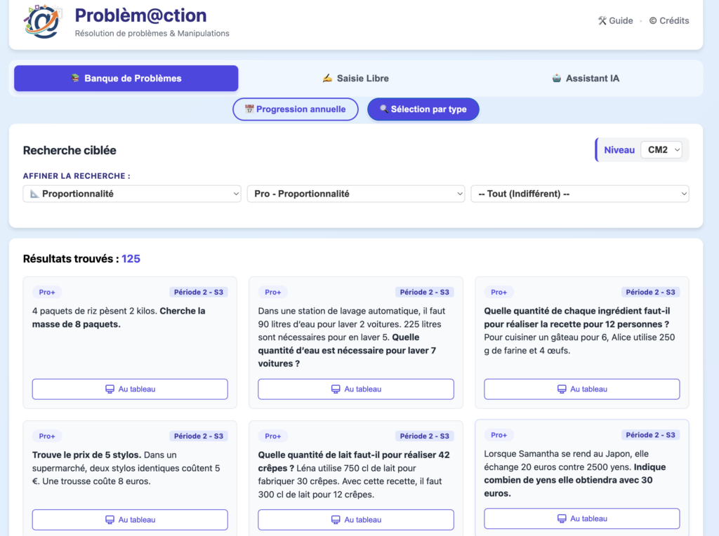 Voici quelques images pour vous faire une idée ; problèmes proposés de la CP au CM2. Possibilité d’avancer en progression annuelle ou par type de problème.